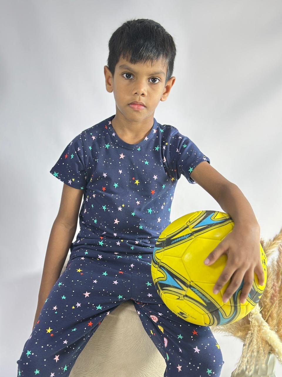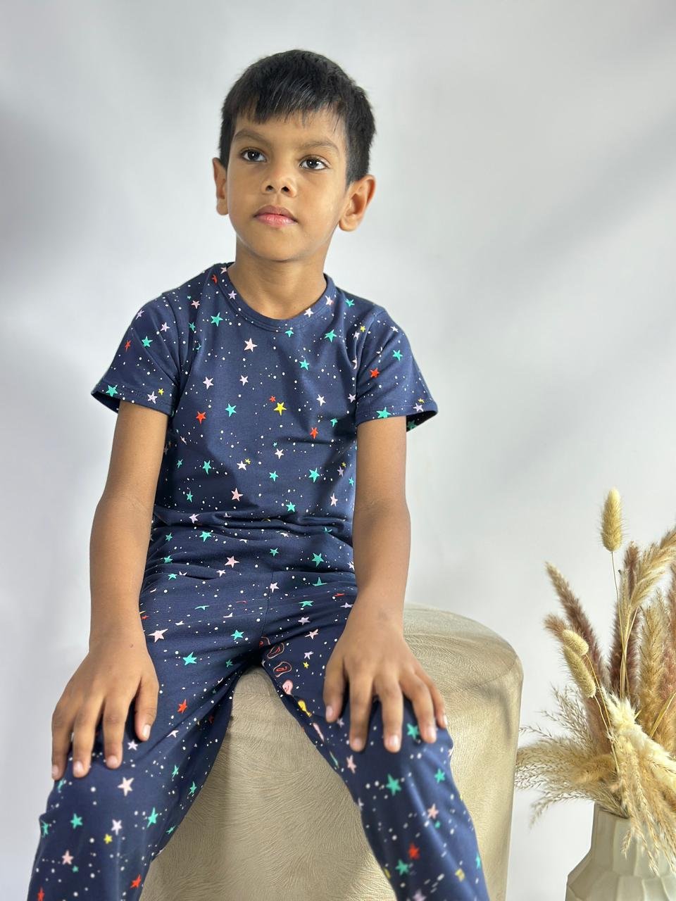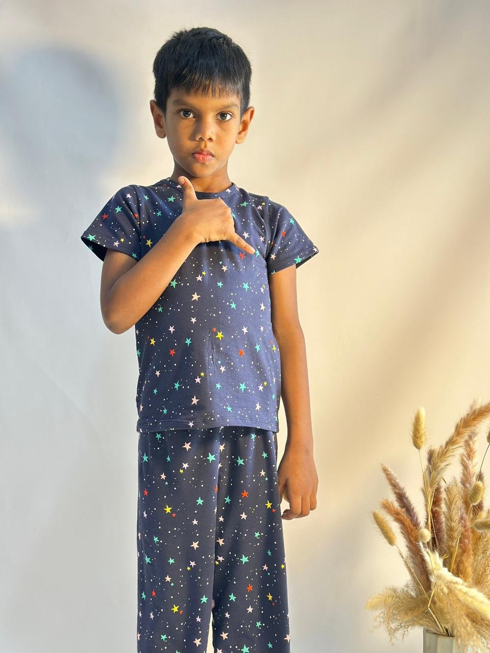 Let your little explorer drift into a galaxy of dreams with our Galaxy Star PJ Set. Featuring a navy base with playful multicolour stars, this cozy set is made from ultra-soft fabric for all-night comfort and cosmic cuteness.